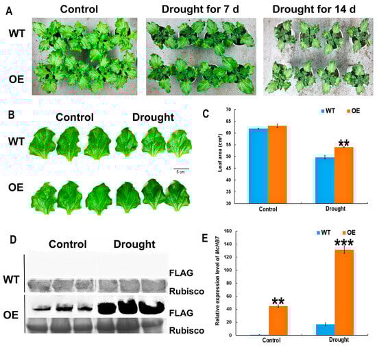 To compare the differences between OE and WT under drought stress, the seedlings at day 7 post infiltration were treated with drought for one week and two weeks (Figure 2A). Under the control conditions, the growth of OE and WT plants was similar (Figure 2A). Under drought stress for 7 days, the OE plants showed higher chlorophyll levels than the WT (Figure 2B). The leaf areas of the OE plants were increased approximately 1.2 times compared to the WT (Figure 2C). Western blot results showed that McHB7 had a higher expression level after drought stress than the control (Figure 2D). RT-qPCR results showed that the relative expression level of McHB7 was 44.6 times in the OE lines compared with the WT under control conditions. Under drought, the relative expression level of McHB7 was induced in the WT while in the OE plants, it was significantly elevated and reached 131.5 times that of the WT (Figure 2E).