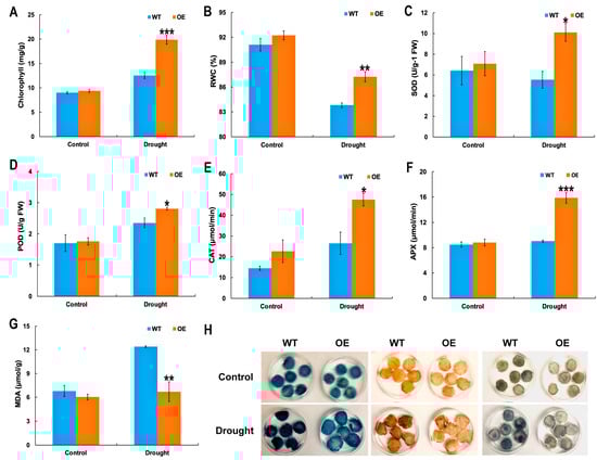 Physiological parameters of the McHB7-OE and WT under salt and drought stress. (A) Chlorophyll content. (B) Relative water content (RWC). (C) Superoxide dismutase (SOD). (D) Peroxidase (POD). (E) Catalase (CAT). (F) Ascorbate peroxidase (APX). (G) Malondialdehyde (MDA). (H) Histochemical staining of the OE and WT under control and drought stress. Student’s t-test: * p < 0.05; ** p < 0.01; *** p < 0.001. Error bars indicate mean ± SD.