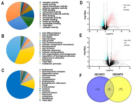 Protein changes in the McHB7-OE and WT under the control and drought conditions. (A) GO (Gene Ontology) annotation of molecular function. (B) GO annotation of biological process. (C) GO annotation of cellular component. (D) Differentially expressed proteins between the OE and WT under control conditions. (E) Differentially expressed proteins between the OE and WT under drought stress. (F) Venn diagram of differentially expressed proteins.