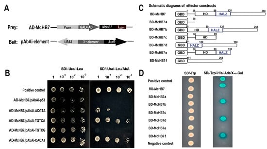 To test whether McHB7 can bind to cis-acting elements like the ABA response motifs ACGTA and TGTCG, the Early Responsive to Dehydration (ERD) motif TGTCA, and the ABA-related motif CACAT [23], each motif was repeated three times. Hind Ⅲ and Sac I restriction sites were added to the primer sequences (Supplementary Table S1) to synthesize complementary DNA strands. Then, the triple tandem of each element was inserted to the pAbAi yeast reporter vector (Figure 4A), which is usually used in one-hybrid assays for identifying and characterizing the DNA-binding proteins. These vectors were named pAbAi-ACGTA, pAbAi-TGTCA, pAbAi-TGTCG, and pAbAi-CACAT, respectively. The full-length of McHB7 was ligated to the pGADT7 (AD) vector named AD-McHB7. The linearized plasmids pAbAi-ACGTA, pAbAi-TGTCA, pAbAi-TGTCG, and pAbAi-CACAT, which were digested by Bstb I at 65 °C for 15 min, were transformed into Y1H Gold yeast competent cells. AD-McHB7 was transformed into the pAbAi-ACGTA, pAbAi-TGTCA, pAbAi-TGTCG, and pAbAi-CACAT yeast competent cells, respectively, and cultured on selective medium without Ura and Leu, or without Ura and Leu but containing 250 ng/mL AbA (Takara, Beijing, China) at 30 °C for four days. pGADT7-53/pAbAi-p53 was used as the positive control, and AD-McHB7/pAbAi-p53 was used as the negative control.