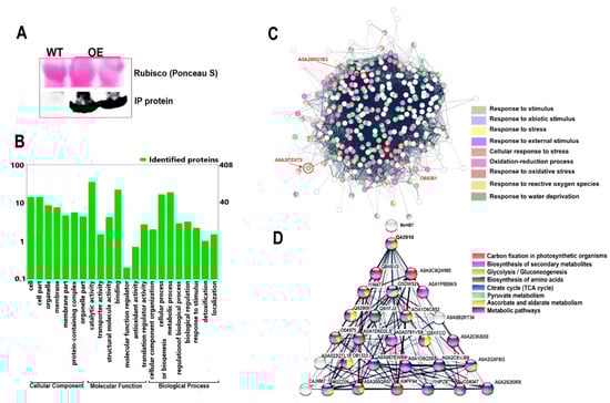 Protein–protein interaction (PPI) analysis of the identified proteins in the immunoprecipitation (IP) of the McHB7–FLAG complex. (A) IP result with the McHB7 bait. Top panel, input of WT and OE showing equal loading with the Rubisco large subunit; bottom panel, Western signal with the anti-FLAG antibody. (B) GO annotation of the 408 proteins in the McHB7 complex. (C) Predicted networks with the identified proteins by STRING; the red circles indicate the proteins related to ABA. (D) PPI network showing McHB7 interaction with Q42910 and its predicted protein interaction network.