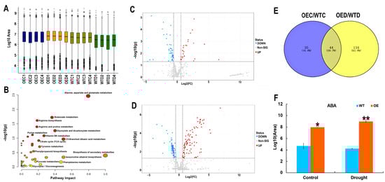 Metabolomic analysis of the OE and WT under the control and drought conditions. (A) Boxplot of the OE and WT samples under the control and drought conditions. (B) Pathway of identified metabolites. (C) Significantly changed metabolites in the OE and WT under control conditions. (D) Significantly changed metabolites in OE and WT under drought conditions. (E) Venn diagram of differentially changed metabolites under the control and drought conditions. (F) Changes in ABA in the OE and WT under the control and drought conditions. Student’s t-test: *, p < 0.05; **, p < 0.01. Error bars indicate mean ± SD.
