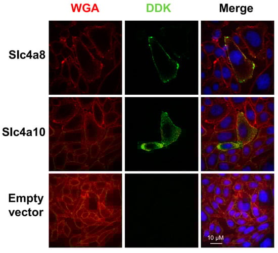 To visualize the plasma membrane, transfected CHO-K1 cells were stained with wheat germ agglutinin (WGA) conjugated to Alexa FluorTM 633 (red fluorescence). Some overlap between WGA- and Slc4a8- (Figure 1, upper panels) or Slc4a10- (Figure 1, middle panels) associated fluorescence was observed, confirming the membrane expression of the recombinant proteins.
