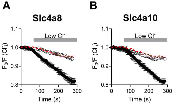 There is no consensus regarding the activity encoded by Slc4a8 and Slc4a10; some reports describe Slc4a8 and Slc4a10 as Na+-HCO3− cotransporters, while other studies show that Slc4a8 and Slc4a10 are Na+-driven Cl−/HCO3− exchangers [12,13,14,15]. To assess whether Cl− fluxes are associated with the activities of Slc4a8 and Slc4a10, we quantified changes in fluorescence intensity in cells loaded with the Cl− indicator SPQ. As seen in Figure 2A,B, a loss in normalized fluorescence (black circles) occurred in response to a reduction in the external Cl− concentration in Slc4a8- and Slc4a10-expressing cells (~20%) that was substantially higher than that observed in non-transfected CHO-K1 cells (~5%, dashed line). We interpret the loss in fluorescence intensity as an increase in the rate of Cl− efflux from the cells. Moreover, Slc4a8- and Slc4a10-mediated Cl− efflux was dependent on HCO3− as little, if any, Cl− efflux was seen in Slc4a8- and Slc4a10-expressing cells measured under HCO3−-free conditions (open circles). The reduction in normalized fluorescence intensity and the change in flow rates was comparable to that obtained from control cells measured under HCO3−-containing solutions (dashed lines).