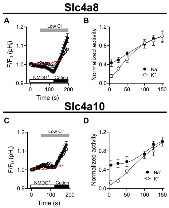 We next evaluated whether Slc4a8 and Slc4a10 activities display a cation dependence. To assess whether HCO3− fluxes are associated with the activities of Slc4a8 and Slc4a10, we quantified changes in fluorescence intensity in cells loaded with the pH− indicator BCECF-AM. Figure 3 shows that no alkalinization was observed in response to external Cl− reduction in Slc4a8- and Slc4a10-expressing cells when N-Methyl-D-Glucamine (NMDG) was the main cation present in the external solution. In contrast, a robust alkalinization was evident when external NMDG was switched to either Na+ or K+ ions in the low Cl− solution. Alkalinization induced by Na+ or K+ in cells expressing Slc4a8 and Slc4a10 occurs in a concentration-dependent fashion (Figure 3B,D). Hill function analyses of dose–response experiments revealed EC50 values of 38.5 mM (Na+) and 40.8 mM (K+) for Slc4a8, while for Slc4a10, values of 54.5 mM (Na+) and 58.0 mM (K+) were obtained.