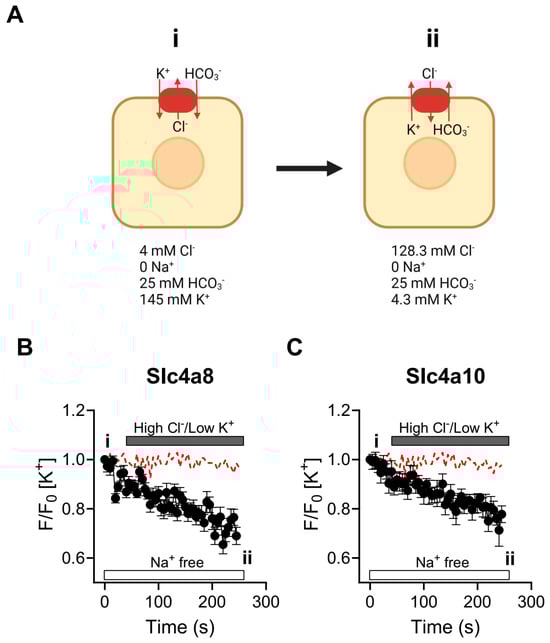 To directly assess whether potassium ions (K+) are being transported by Slc4a8 and Slc4a10, we employed the K+-selective probe PBFI-AM to measure intracellular potassium concentrations ([K+]i) during stimulated exchanger activity. Due to the slight preference for K+ over Na+ ions (~1.5 times) displayed by PBFI, the experiments were conducted under Na+-free conditions to eliminate potential interference of the K+ signal by Na+ ions, as outlined by Minta and Tsien in 1989 [16]. The experimental design, depicted in Figure 4A, is supported by our previous work [11]. In brief, cells were loaded with PBFI-AM and exposed to a low-chloride ([Cl−]), Na+-free, and high-potassium ([K+]) external solution to deplete cellular chloride (Figure 4A, condition i). If Slc4a8 and Slc4a10 facilitate K+ transport, it would be anticipated that the combination of inwardly directed Cl− and outwardly directed K+ gradients (achieved by increasing [Cl−]o and decreasing [K+]o) would induce Cl− influx in exchange for K+ − HCO3− efflux (Figure 4A, condition ii). As shown in Figure 4B,C, a sustained reduction in [K+]i was observed when these gradients were imposed on Slc4a8- and Slc4a10-expressing cells. In contrast, minimal or no K+ efflux was detected in non-transfected cells, strongly supporting the proposition that Slc4a8 and Slc4a10 indeed facilitate the transport of K+ ions.