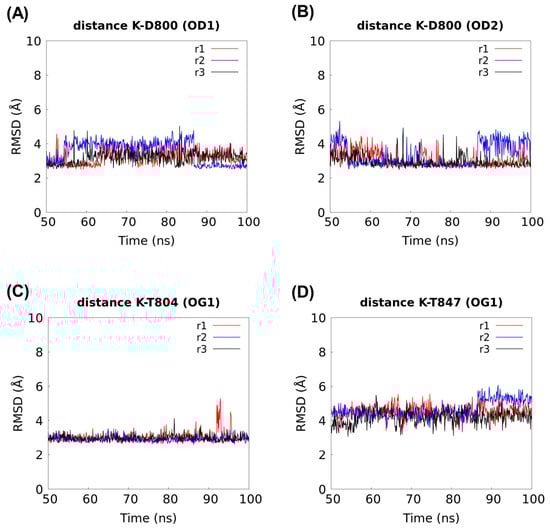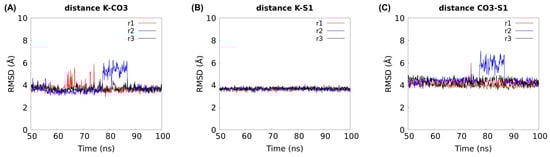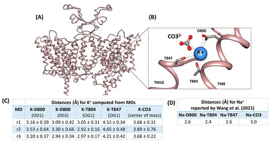 We found that K+ remains in contact with D800, T804, and T847 along all MD simulations (Figure 5) and that the K+-residue distances (Figure 6C) are comparable to those reported for Na+ (Figure 6D) [17]. In addition, we evidenced that K+ and CO32− are interacting with an average distance of 3.7 Å (Figure 6C) and that they sustain interactions (Figure 7A) that do not dissociate from the S1 site during 50 ns MD simulations (Figure 7B,C). Distances between each ion to S1 site were calculated from the Cα atom of residue A846 (Figure S1).