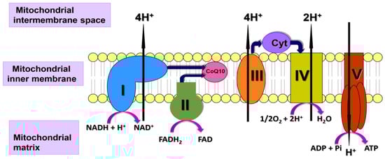 Diagram of the mitochondrial electron transport chain (ETC) showing the involvement of CoQ10 in the process of oxidative phosphorylation. ETC Complexes I–IV (I–IV) and the electron carriers coenzyme Q10 (CoQ10), cytochrome c (Cyt), and protons (H+).