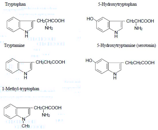 - Hirata, F.; Hayaishi, O. New degradative routes of 5-hydroxytryptophan and serotonin by intestinal tryptophan 2,3-dioxygenase. Biochem. Biophys. Res. Commun. 1972, 47, 1112–1119. [Google Scholar] [CrossRef] [PubMed]