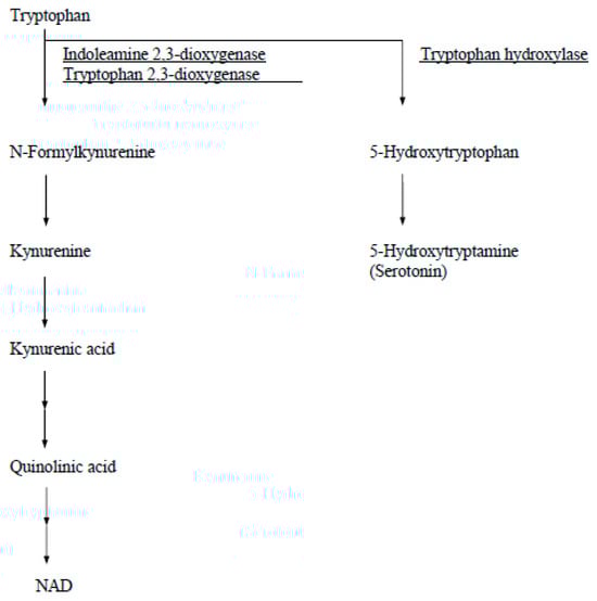In human tissue, IDO is detectable immunohistochemically from day 6 human blastocysts and thereafter throughout pregnancy in syncytiotrophoblasts, cytotrophoblasts, and macrophages in the villous stroma and in the fetal membranes []. Other tryptophan catabolizing enzymes in humans are tryptophan 2,3-dioxygenase (EC 1.13.11.11) and tryptophan hydroxylase (EC 1.14.16.4) (Figure 2). Tryptophan 2,3-dioxygenase is found only in the liver and is induced by administration of tryptophan. Tryptophan hydroxylase, which is expressed by neuronal cells of the brain and adrenal gland, is the first step in the synthesis pathway for serotonin and its derivatives.