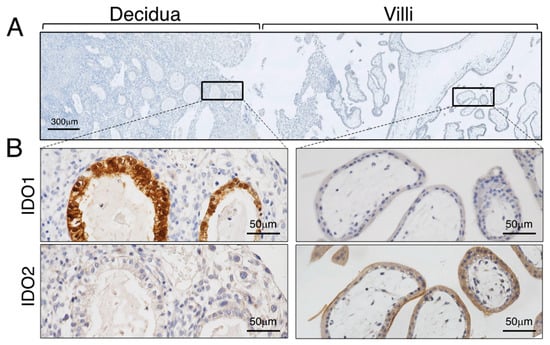Immunohistochemistry of IDO at the maternal–fetal interface of seven weeks of gestation. (A) Implantation site of seven weeks of gestation. (B) Immunohistochemical localization of IDO. Reproduced from Kudo et al. []. Scales for images are as indicated.
