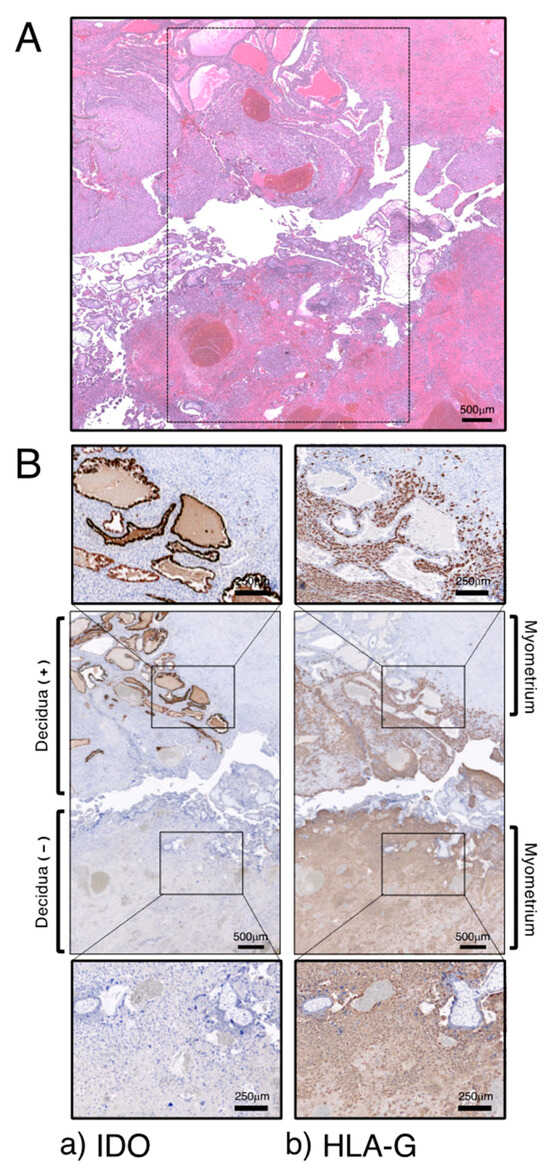 Immunohistochemical localization of IDO in decidua. (A) HE staining. (B) Immunostaining for IDO (a) and HLA-G (b). Reproduced from Kudo et al. []. Scales for images are as indicated.