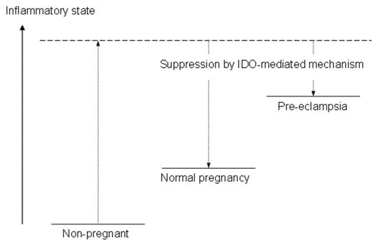 The maternal syndrome of pre-eclampsia is a major complication of human pregnancy with significant morbidity and mortality. Although the cause of pre-eclampsia is still unknown, there is strong evidence linking the clinical condition to abnormalities in placental development, leading to increased oxidative stress [,] and dysfunction in maternal endothelial cells []. In addition to endothelial dysfunction, systemic activation of maternal inflammatory cell populations has been observed []. Munn et al.’s hypothesis suggests that placental IDO suppresses the maternal immune response against the fetus by depleting tryptophan at the maternal–fetal interface. It is possible to suggest that alterations in IDO activity or levels in the placenta may be involved in the pathogenesis of pre-eclampsia.