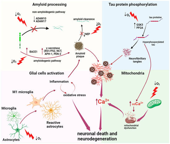 In summary, hypoxia can trigger several mechanisms implicated in the pathogenesis of Alzheimer’s disease. Oxygen deprivation can induce the amyloidogenic cleavage of APP, leading to the accumulation of Aβ, which serves as the primary pathological trigger of AD. The pathological effects of Aβ on calcium homeostasis in the neurons and astrocytes contribute to neuronal cell death. Moreover, hypoxia not only promotes the formation and accumulation of Aβ but also independently disrupts the regulation of calcium homeostasis (in both the neurons and astrocytes) and induces oxidative stress, both of which contribute to neuronal cell death. Furthermore, Aβ accumulations may activate the microglia through a neurotoxic pathway, initiating a maladaptive neuroinflammatory response that exacerbates neurodegeneration. Additionally, hypoxia itself triggers neuroinflammation and neurodegeneration, which can be regarded as another initiating pathological trigger of AD.