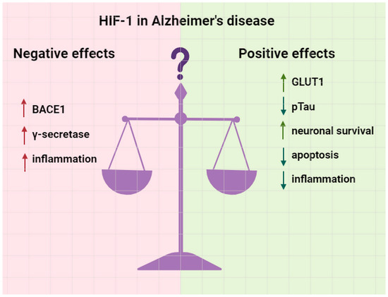 Figure 3. The double-edged sword of HIF-1 in Alzheimer’s disease pathogenesis. Vertical up arrows indicate increasing expression or activity, downward vertical arrows indicate decreased expression or activity. Green arrows indicate positive effects, red arrows indicate negative ones.