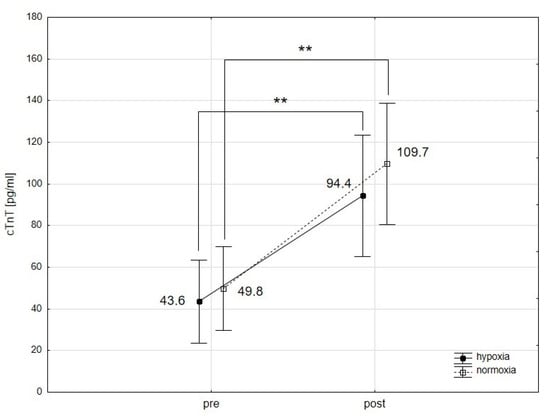 Troponin T (cTnT) levels before (pre) and after (post) a single intense interval exercise session in normoxia and hypoxia. ** p < 0.01 denote statistically significant differences (pre vs. post).