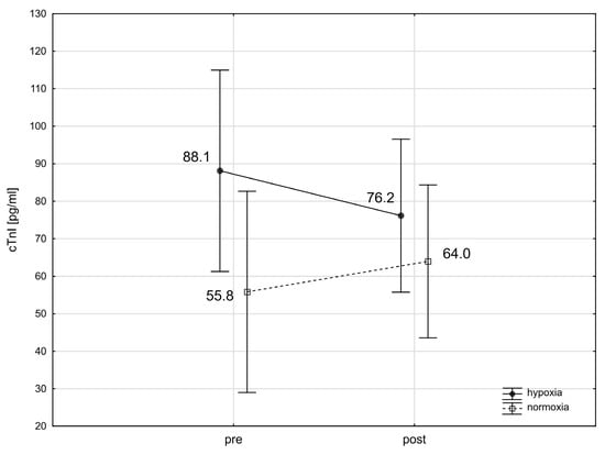 In our study, the post-exercise increase in cTnI activity was found to be more significant after normoxic condition training (Group N) than before training began. The experimental group training under hypoxia did not show similar changes. Such differences could be attributed to the lesser absolute workload, which imposed less strain on participants in the experimental group. Interestingly, after a single session of interval exercise in hypoxia, both before and after the training program, there was a visible downward trend in cTnI levels, while in normoxia, cTnI activity increased. This suggests the possibility of a mechanism that reduces activity or slows the kinetics of cTnI concentration changes under hypoxia, warranting further research. Many authors [,,] also emphasize significant individual variation in the post-exercise release of troponins, as was evident in our study as well.
