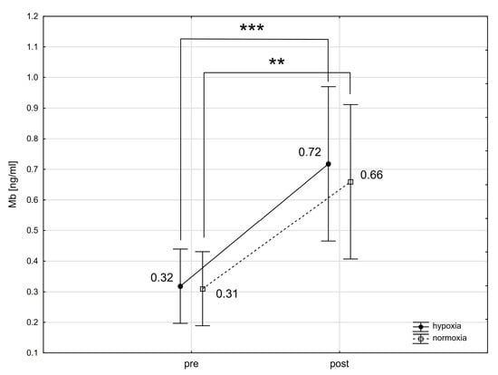 Myoglobin (Mb) levels before (pre) and after (post) a single intense interval exercise session in normoxia and hypoxia. *** p < 0.001, ** p < 0.01 denote statistically significant differences (pre vs. post).