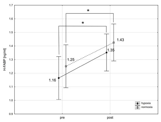 Heart-type fatty acid-binding protein (H-FABP) levels before (pre) and after (post) a single intense interval exercise session in normoxia and hypoxia. * p < 0.05 denote statistically significant differences (pre vs. post).