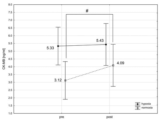 Previous research on the CK-MB response to physical exercise has shown an increase in CK-MB levels during and after both prolonged endurance activities [,], short bouts of high-intensity effort [,], and resistance training []. However, there have been a few instances where studies reported no change or even a reduction in CK-MB activity post-exercise compared to resting levels []. Our study found that CK-MB levels remained largely unchanged after a single session of exercise in hypoxia, while exercise in normoxia resulted in a slight increase in CK-MB (p < 0.07). These variations could be attributed to the different relative loads applied in interval exercises. In our study groups, the relative load (%VO2max) was tailored to the specific conditions (normoxia vs. hypoxia; refer to the methodology section). Consequently, in hypoxic conditions, participants engaged in mechanically less demanding work (approximately 10% lighter), which could explain the diminished CK-MB response to the exercise [,]. Moreover, the significant difference in baseline CK-MB concentrations before exercising in hypoxic and normoxic conditions (5.33 vs. 3.12 ng/mL) could have influenced the observed post-exercise changes in CK-MB levels.