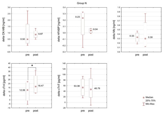 The response of cardiac markers to interval exercise before (pre) and after (post) training under normoxic conditions (Group N). * p < 0.05 denotes statistically significant differences when compared to the values measured before training.