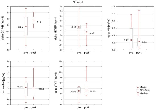 The Wilcoxon matched-pairs test revealed that the change (delta) in the cTnT concentration after interval exercise in normoxia was significantly more pronounced (T = 3.00; p < 0.05; ES: 0.73) post-training in normoxia (Group N) compared to the change observed before training. No analogous changes were detected post-training in hypoxia (Group H). Moreover, training did not result in statistically significant changes in the response of other analyzed cardiac markers to interval exercise in either the N or H groups (Figure 6 and Figure 7).