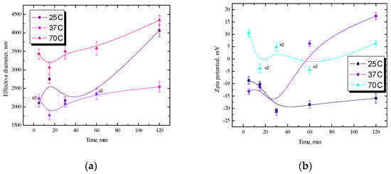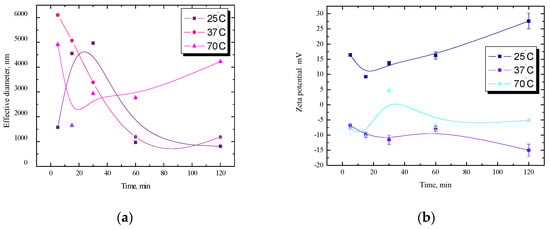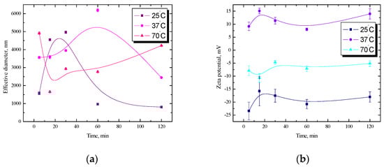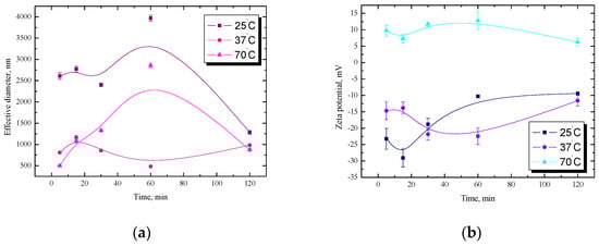 In Figure 1, the relationships of the effective diameter and the zeta potential as a function of time for starch dispersion in a 10−3 M NaCl solution at three temperatures, 25 °C, 37 °C, and 70 °C, are presented. As was mentioned earlier, during gelatinization, firstly, the amorphous parts of the starch granule are hydrated, which induces swelling of the granules, leading to a distortion of the crystalline area. Secondly, the crystalline regions become more accessible to water. Thus, the size of starch granules increased with temperature increase from 25 °C to 70 °C (Figure 1a).