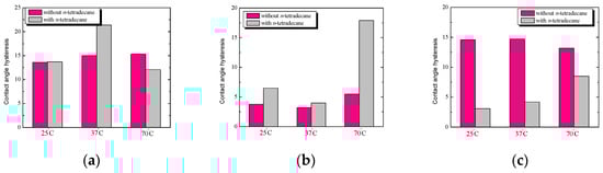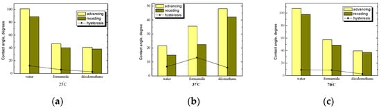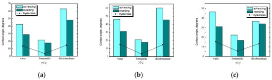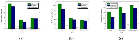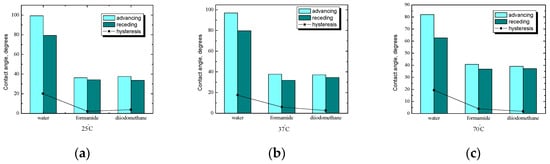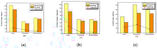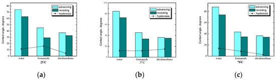 At a temperature of 70 °C (Figure 8c), the trend of the measured contact angles and hysteresis changed significantly. This is the reverse of what is obtained at a physiological temperature. The value of the contact angle of formamide is the highest (at lower temperatures, the angle value was much lower), while in the case of water, the average value of the angle is lower, whereas at lower temperatures, it was much higher.