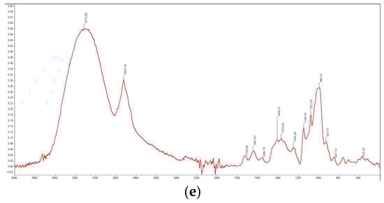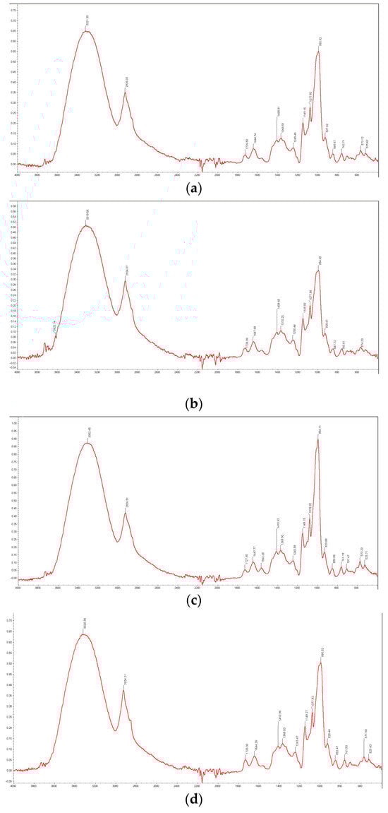 At the highest temperature, the hysteresis value of the water angles for the tested plates without n-tetradecane film is higher than for the plates with the film. The obtained hysteresis values of the formamide angles for the starch/PC plates without and with n-tetradecane film, depending on the starch preparation temperature, are shown in Figure 9b. For PC, modified starch OH stretching and skeletal mode were slightly shifted compared to the native starch. Changes in the intensity of specific bands are found to be the major spectral ones during gelation. Gelatinization is primarily a hydration process, and chain conformation and helicity change when crystallinity and molecular orientation are lost. The signal around 1000 cm−1 is related to the intermolecular hydrogen bonding of hydroxyl groups or the plasticizing effect of water [,].