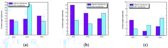 In Figure 13, the hysteresis of water, formamide, and diiodomethane angles on the S/Lys surface with and without n-tetradecane film was compared depending on the starch preparation temperature. In Figure 13, at 25 °C and 70 °C, the hysteresis values of the water contact angle for S/Lys plates with n-tetradecane film are very similar and amount to about 10°. At physiological temperature, the effect of n-tetradecane is most noticeable. For room and physiological temperature, the hysteresis values are twice as high for the S/Lys plates without n-alkane film compared to the same plates with the film.