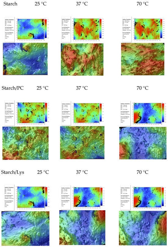 The obtained images of the starch surface by profilometer show topographical differences between the native starch surface and that modified by a biological solution. For example, the height distribution shows that the starch surface is covered mostly by patches. The hydrophilization of the starch surface after PC modification is caused by the rearrangement of the hydrophobic monolayer into bilayer patches with the head polar groups exposed toward water drop. Attractive interactions between starch and PC may cause complex formation. This strong association can cause film condensation and smoothing. Indeed, the monolayer of PC on the starch makes the surface smoother. Reduced values of all roughness parameters were obtained compared to the native starch surface; although, in order to explain changes in surface roughness, the type and size of interactions between starch molecules and the additional layer should be taken into account. Due to the polar nature of water, its molecules have a strong tendency to form hydrogen bonds. Therefore, there may be a structural rearrangement of PC or Lys molecules on the starch surface and an increase in the polarity of the starch surface after its modification. This effect decreases as the temperature increases. On the other hand, the lysozyme reduces the hydrophobic nature of the starch surface.