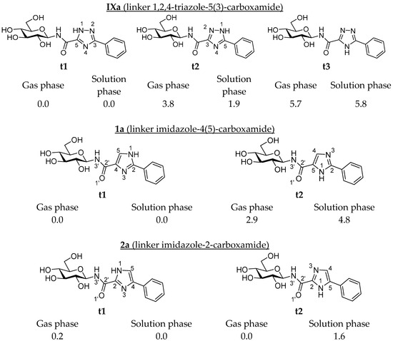 Non-classical bioisosteric replacements [22,23] of the highlighted amide moiety in I with several oxadiazole-type heterocycles were previously studied (Table 1, VI–VIII), which, however, resulted in no better inhibitors than I. Meanwhile, in silico docking calculations have been performed on N-(β-d-glucopyranosyl)-3-substituted-1,2,4-triazole-5-carboxamide analogues IX with aryl substitutions: phenyl (a), 1-naphtyhl (b) and 2-naphthyl (c) [24]. The phenyl-substituted IXa was reported as the most potent of the three analogues acting at the catalytic site, with a Ki of 1 µM for rabbit muscle glycogen phosphorylase b (rmGPb).