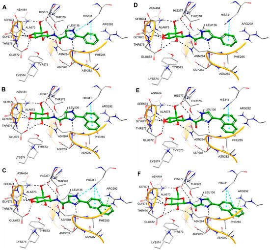 Predicted GP-binding interactions of target ligands 1a–c in their respective panels (A–C) and 2a–c shown in their respective panels (D–F). Binding poses were based on Glide SP docking calculations, as described in the text. Hydrogen bonds are shown as black dash lines; π-π interactions as dashed cyan lines; cation-π interactions as dashed green lines.