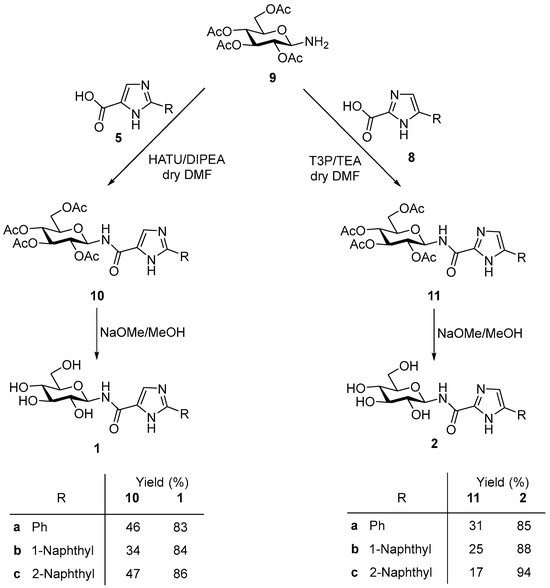 To the solution of 2-aryl-1H-imidazole-4(5)-carboxylic acid (1 equiv.) in dry DMF (1 mL), DIPEA (5 equiv.) and HATU (1.2 equiv.) were added, and the mixture was stirred for 15 min; then, a solution of 2,3,4,6-tetra-O-acetyl-β-d-glucopyranosyl amine (9) (1.5 equiv.) in dry DMF (1 mL) was added to it. The reaction mixture was stirred overnight at room temperature. Then, the reaction mixture was diluted with water and extracted with EtOAc. The combined organic layers were washed with water and brine, dried over MgSO4 and filtered, and the solvent was removed under reduced pressure. The crude product was purified using column chromatography.