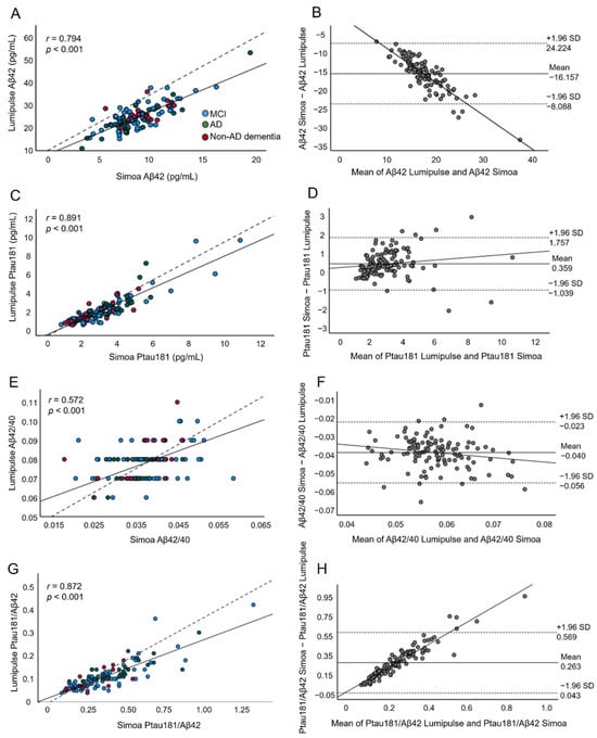 The correlation and Bland–Altman plots for the Aβ42 (A,B), Ptau181 (C,D), Aβ42/40 (E,F), and Ptau181/Aβ42 (G,H) measurements obtained by the Lumipulse and Simoa methods (n = 127). Each point was defined as the Lumipulse and Simoa assay measurements for the same biological sample; in the correlation plots, the blue, green, and red dots represent MCI, AD, and non-AD dementia subjects, respectively. The solid lines represent the estimated regression line, and the dotted line represents the identity line (x = y); in the Bland–Altman plots, the solid lines represent the slopes observed.
