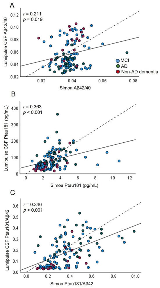 Correlation plots for CSF (Lumipulse) and plasma (Simoa) measurements of Aβ42/40 (A), Ptau181 (B), and Ptau181/Aβ42 (C) (n = 127). Each point was defined as the measurement for the same marker detected in CSF and plasma from the same biological sample; the solid lines represent the estimated regression line, and the dotted line represents the identity line (x = y).