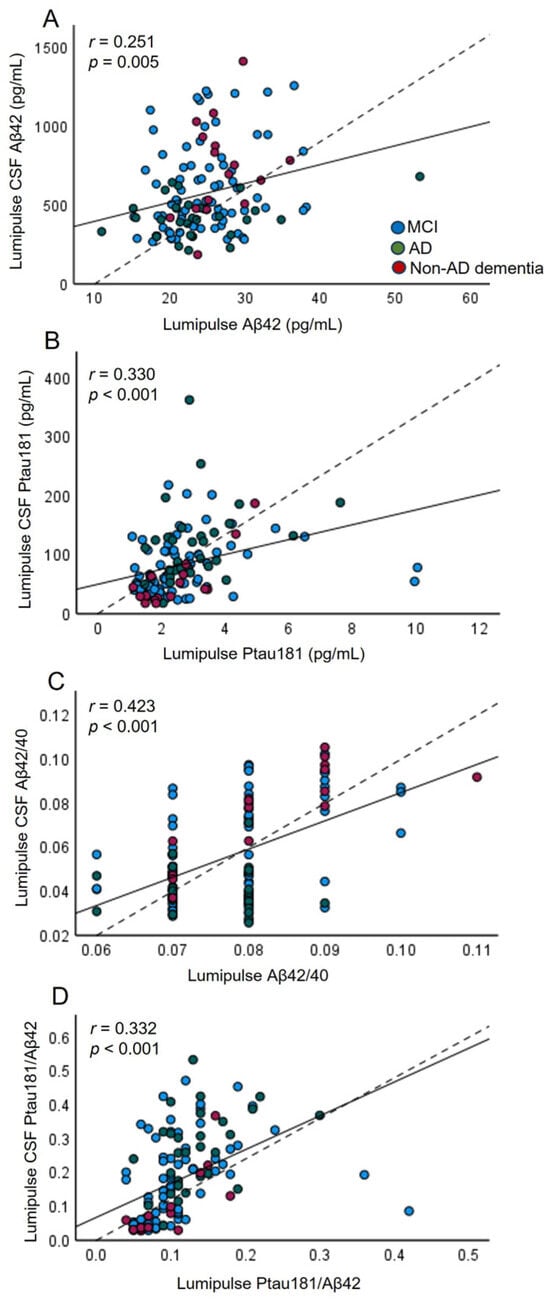 - Martínez-Dubarbie, F.; Guerra-Ruiz, A.; López-García, S.; Lage, C.; Fernández-Matarrubia, M.; Infante, J.; Pozueta-Cantudo, A.; García-Martínez, M.; Corrales-Pardo, A.; Bravo, M.; et al. Accuracy of plasma Aβ40, Aβ42, and p-tau181 to detect CSF Alzheimer’s pathological changes in cognitively unimpaired subjects using the Lumipulse automated platform. Alzheimer’s Res. Ther. 2023, 15, 163. [Google Scholar] [CrossRef] [PubMed]