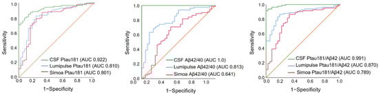 Consistently with the results from Simoa, Lumipulse Ptau181 and Ptau181/Aβ42 also performed well in discriminating Aβ42/40-positive and Aβ42/40-negative status (AUC 0.810 and 0.870, respectively). Additionally, the plasma Aβ42/40 concentration measured by Lumipulse exhibited good discriminating power (AUC 0.813) in contrast to the Simoa Aβ42/40 concentration (AUC 0.641). This may be due to the use of the Lumipulse platform for the determination of both plasma and CSF Aβ42 and Aβ40 levels.