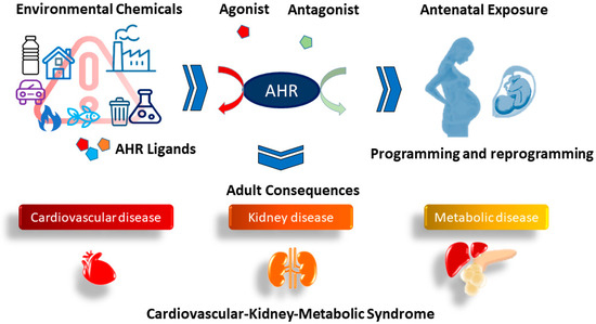 Although the detrimental effects of AHR activation due to adult exposure to environmental chemicals on cardiovascular–kidney–metabolic health are well-established, our understanding of its involvement in the chemical-induced programming of CKM syndrome remains limited. Therefore, this review aims to delineate the impact of prenatal chemical exposures on CKM programming by synthesizing the available epidemiological and experimental evidence, with a particular emphasis on AHR signaling. Furthermore, we discuss potential interventions targeting AHR for reprogramming purposes to mitigate the onset of CKM syndrome.