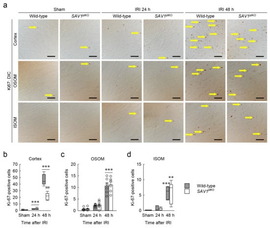 2.4. SAV1 Deficiency in Proximal Tubules Delays Cell Proliferation in the Cortex after IRI