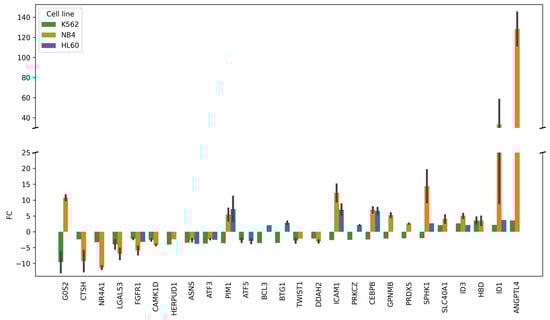 All processing steps were executed with the R-package “limma”. Background correction on the fluorescent intensities was performed using the” backgroundCorrect” function with “normexp” as the method followed by normalization by the “normalizedBetweenArray” function using the “quantile” method. The intensity values were log2-transformed. Control probes and probes with intensities below background noise were filtered out. Values for within-array duplicate probes are replaced with their average using the “avereps” function by “Probe name” and “GeneName” columns. Data were normalized separately for HL-60, NB4, and K562 cell lines. The p-value was adjusted with a Benjamini–Hochberg (BH) multiple testing correction. The transcriptomic data were deposited into the ArrayExpress repository through the Annotare submission system (v. 2.0, EMBL-EBI, Hinxton Cambridge, UK). The data were uploaded to the BioStudies repository and available with accession number E-MTAB-13723.