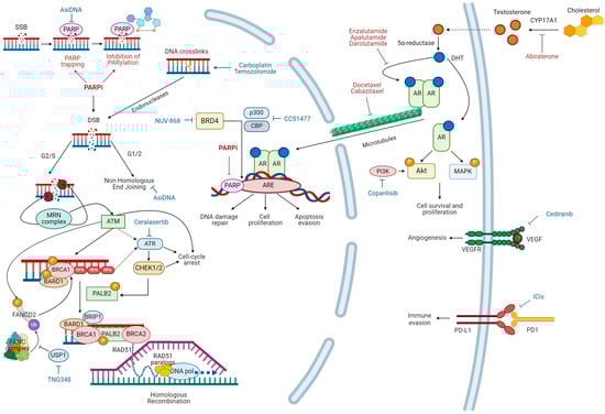 When a DNA single-strand break (SSB) happens, poly (ADP-ribose) polymerase (PARP) guides SSB repair through NAD+poly(ADP-ribosyl)ation (PARylation) of histones and chromatin remodeling enzymes. PARP inhibitors (PARPis) act mainly by trapping PARP and by inhibiting PARylation. Unrepaired SSB leads to DNA double-strand break (DSB) during DNA replication. DSB is mainly resolved by homologous recombination repair (HRR) during the G2/S phase of cell cycle. During G1/G2 and in HRR deficient cells, DSB is solved by the error-prone non-homologous end-joining pathway with consequent genomic instability and cell death. HRR is activated by the recognition of DSB by the MRN complex that resects DNA ends, leading to the formation of single-strand DNA (ssDNA). ssDNA is preserved from degradation by RPA. The MRN complex activates ATM and that with RPA contributes to ATR activation. ATM and ATR phosphorylate several proteins such as CHEK1/2. ATM, ATR, and CHEK1/2 mediate cell cycle arrest. FANCD2 contributes to BRCA1 activation once monoubiquitinated by FANC and phosphorylated by ATM. BRCA1-BARD1 complex facilitates DNA end resection and interacts with the bridging protein PALB2 phosphorylated by CHEK2. PALB2 recruits BRCA2. PALB2 and BRCA2 remove RPA and facilitate the assembly of RAD51. RAD51 and RAD51 paralogs mediate strand invasion of ssDNA into the intact sister chromatid, searching a homologous template for DNA synthesis by DNA polymerase (DNA pol). DNA repair process interacts with androgen receptor (AR) pathway. CYP17A1 is a key enzyme for testosterone synthesis from cholesterol. Testosterone is metabolized to 5α-dihydrotestosterone (DHT) by 5α-reductase. DHT exerts its biological effects by binding AR in the cytoplasm. A rapid non-genomic signaling pathway contributes to cell proliferation by activation of MAPR/ERK and PI3K/AKT pathways. In addition, once it has bound the ligand, AR homodimerizes and translocates into the nucleus, where it binds to the androgen response element (ARE) located at the promoter regions of genes involved in DNA damage repair, cell proliferation and apoptosis evasion. PARP plays also a role in androgen-dependent transcription. Drugs currently used in clinical practice alone or in combination with PARPis for the treatment of prostate cancer are labelled in red. Abiraterone is a CYP17A1 inhibitor. Enzalutamide, apalutamide, and darolutamide competitively inhibit DHT binding to the AR, nuclear translocation of the AR, and DNA binding. Docetaxel and cabazitaxel inhibit AR nuclear translocation by targeting AR association with microtubules. Drugs that are currently being explored in combination with PARPis are labelled in blue.
