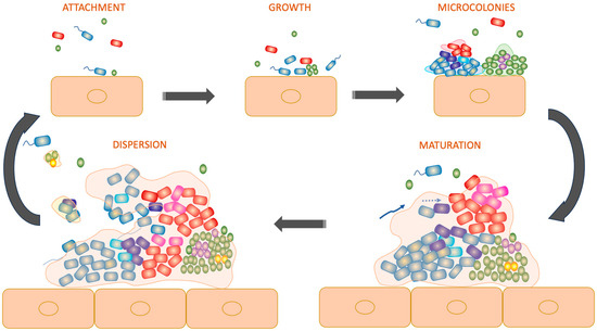Graphic representation of biofilm formation within a wound, starting from the attachment of bacteria and followed by growth, the formation of microcolonies, the maturation phase, and finally, dispersion.