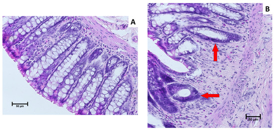 Samples of the large intestine were fixed in 10% buffered formaldehyde, and dehydrated by successive immersion in a gradient of ethanol solutions. Subsequently, the samples were rinsed with xylene, embedded in paraffin blocks, and cut into 5 μm sections. The sections were stained with haematoxylin and eosin (H&E) for evaluation under a light microscope (Motic BA400, Olympus Corporation, Tokyo, Japan) by a veterinarian histopathologist.