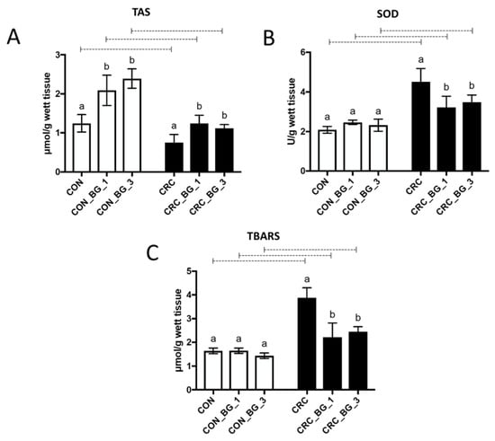 24]. In our study, the colorectal tissue of rats with AOM-induced CRC showed a strong accumulation of lipid peroxidation products, expressed as the sum of TBARS. The lowest TBARS concentration was noted in control groups, irrespective of OBG supplementation, indicating that the protective effect of OBG was not observed in healthy animals.
