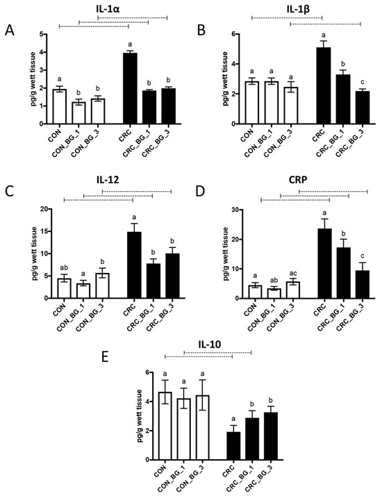 30]. Our present study demonstrated that the concentration of pro-inflammatory interleukins IL-1α, IL-1β, IL-12, and C-reactive protein (CRP) was increased in the colorectal tissues of rats with AOM-induced CRC, whereas the concentration of the anti-inflammatory IL-10 was decreased in CRC. Supplementation of feed with the low-molar-mass OBG led to decreased concentrations of the pro-inflammatory cytokines (IL-1α, IL-1β, IL-12) in the colorectal tissue of rats with AOM-induced CRC to levels comparable with healthy control rats. Our previous research also showed that dietary supplementation with oat beta-glucans protected the large intestine from inflammation, in that case induced by LPS [