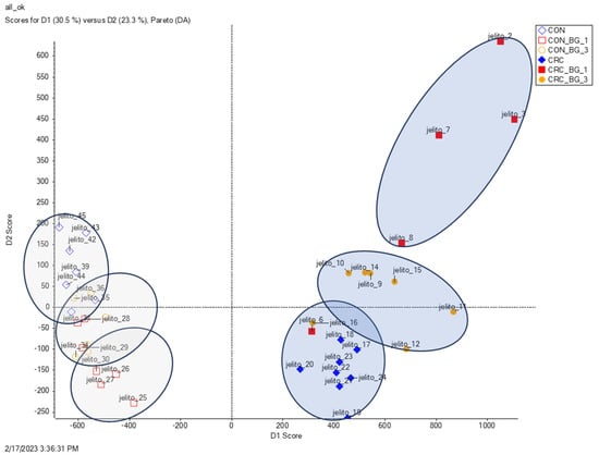 The metabolite profiles, obtained within the 100–1100 Da range with a sensitivity of 5 cps, were analysed using SCIEX MarkerView™ software (ver.1.3.1.). Comparative assessments between groups were conducted using Student’s t-tests and principal component analysis (PCA). The generated metabolomic profiling data sets were processed by the control software of the SCIEX Analyst® (ver.1.7.3) mass spectrometer and saved in a specific data format (*.raw). The first step was to convert data from Excalibur-specific raw files to open format files (*.mzXML) using MS Convertor software (MSConvert ver. 1.5.2.). Subsequently, the metabolomic data were processed using the XCMSplus platform. Additionally, PCA resulted in comparative profiles of metabolomes of specific groups, which were further analysed by SCIEX MarkerView™ software. The classification of identified metabolites within particular metabolic pathways was conducted using the XCMSplus on-line platform and MetaboAnalyst 5.0 software with a probability threshold of p < 0.0001. The identification of metabolites was carried out based on the ChemSpider database (accessed via SCIEX PeakView™ ver.2.2). Indications above an 80% probability of confirming a given structure were compared with the indications of metabolites from the MetaboAnalyst 5.0 database.