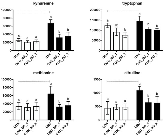 43]. In our study, the quantitative analysis confirmed that in the group of rats with CRC and consuming feed supplemented with the oat beta-glucan (CRC_BG_1 and CRC_BG_3), the concentration of kynurenine decreased to the concentrations observed in animals from the control group (CON), while the highest concentration was observed in the large intestine of animals from the CRC group. Such modulation may contribute to a less favourable environment for tumour survival and invasion.