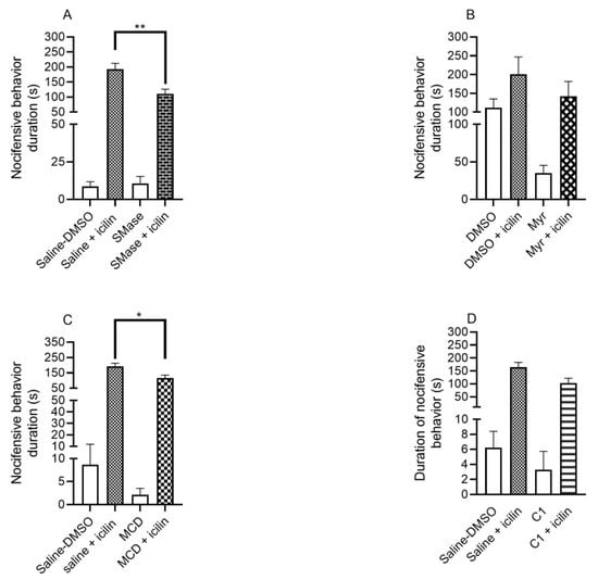 2.2. SMase and MCD Reduced the Duration of Icilin-Induced Nocifensive Behavior
