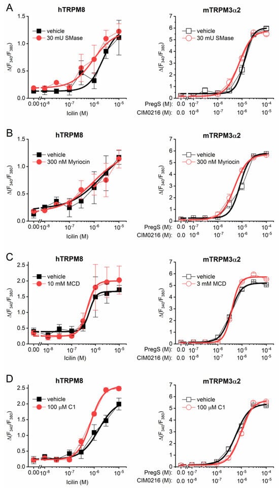 Effect of lipid raft disruptors on the agonist-induced activity of TRPM8 and TRPM3. HEK293T cells overexpressing either human TRPM8 (hTRPM8) or TRPM3α2 variant of mouse TRPM3 (mTRPM3α2) were pretreated with (A) SMase, (B) Myriocin, (C) MCD, and (D) C1 compound and subjected to [Ca2+]IC measurements upon applying various concentrations of agonists, as indicated in the figure. Each data point is presented as the mean ± SEM of three independent measurements (n = 3). Concentration–response curves were fitted as described in the Section 4.